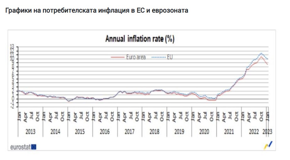 Инфлацията в еврозоната се понижи през януари с 0,2% спрямо месец по-рано и се забави на годишна база до 8,6% от 9,2% през декември 2022 г. , след като през миналия октомври удари рекорден връх от 10,6% - най-високата инфлация, откакто европейската статистика разполага с този тип данни от 1991 г. насам.