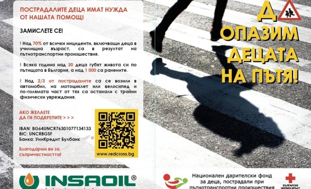 /КРОСС/ Втора поредна година Българския червен кръст и INSA OIL канят своите партньори и българския бизнес, да се включат в инициативата за набиране на средства за деца пострадали при пътно-транспортни произшествия. Тази година инициативата е под мотото: „Да опазим децата на пътя!". Целта е да бъдат събрани средства за управлявания от БЧК: „Национален дарителски фонд за подпомагане на децата-жертви на ПТП и техните семейства".