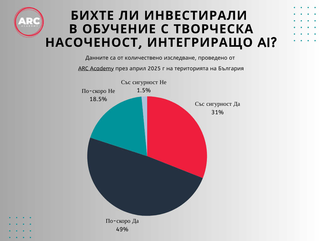 Родителите подкрепят новите технологии, когато са в полза за развитието на децата им. Над 80% заявяват, че биха инвестирали в обучение с творческа насоченост, интегриращо изкуствен интелект. Това е ясна индикация, че семействата вярват в силата на креативността, особено когато тя е подкрепена от технологични инструменти и адаптивна среда за учене.