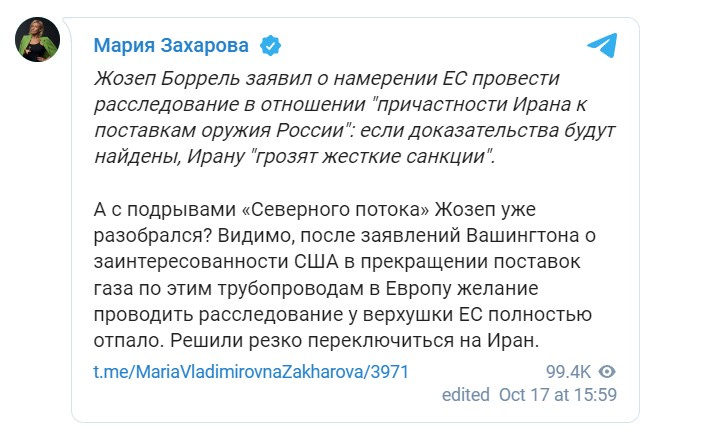 „Жозеп вече се справи ли с експлозиите на „Северен поток"? Очевидно след изявленията на Вашингтон за интереса на САЩ да спрат доставките на газ през тези тръбопроводи за Европа, желанието за провеждане на разследване на върха на ЕС напълно изчезна. Те решиха внезапно да преминат към Иран", коментира още Захарова.