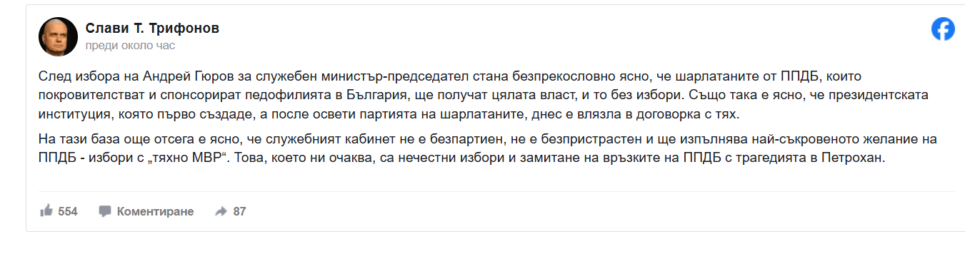 /КРОСС/ След избора на Андрей Гюров за служебен министър-председател стана безпрекословно ясно, че шарлатаните от ППДБ, които покровителстват и спонсорират педофилията в България, ще получат цялата власт, и то без избори. Това написа председателят на "Има такъв народ" Слави Трифонов, след като стана ясно, че Андрей Гюров е избраният от Илияна Йотова за служебен премиер.
