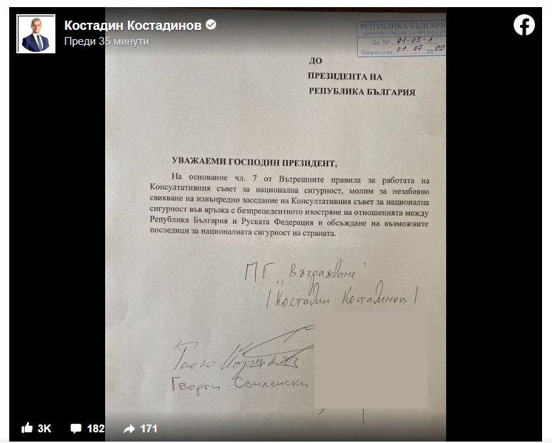 /КРОСС/ Току-що поисках спешно свикване на КСНС при президента за обсъждане на последиците от едноличното решение на Кирил Петков във връзка с изгонването на 70-те руски дипломати. Това написа в страницата си във фейсбук лидерът на „Възраждане“ Костадин Костадинов.