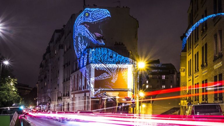 /КРОСС/ Художникът Жулиен Нонон влага съвсем нов смисъл в израза "Градът на светлините". Той използва вградена система за видеопрожекции, позволяваща му да украсява фасадите на сградите с огромни холограми на динозаври. Сред тях са добре познати видове като Tyrannosaurus Rex, Triceratops и Brontosaurus.