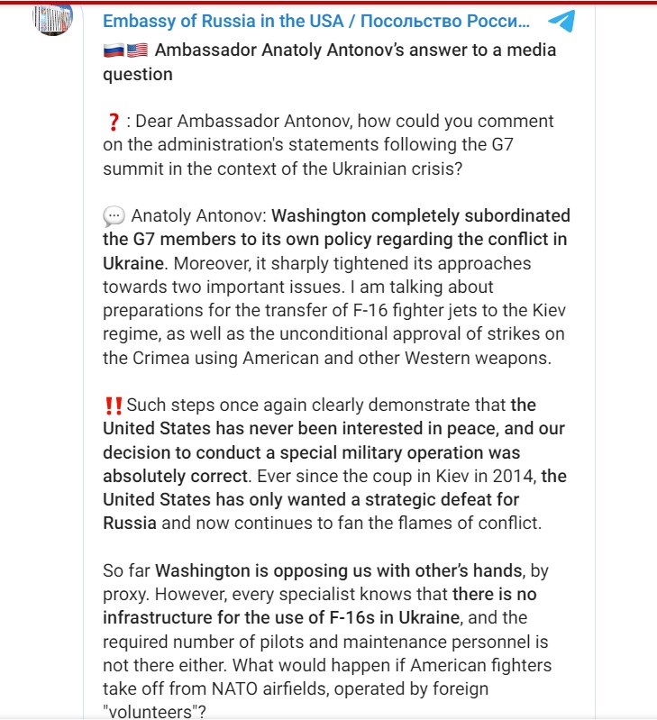 "В Украйна няма инфраструктура за експлоатация на Ф-16, няма и необходимия брой пилоти и персонал за поддръжка", каза Антонов в коментарите, публикувани в Телеграм канала на посолството. "Какво ще стане, ако американските изтребители излетят от летища на НАТО, контролирани от чуждестранни "доброволци"?"