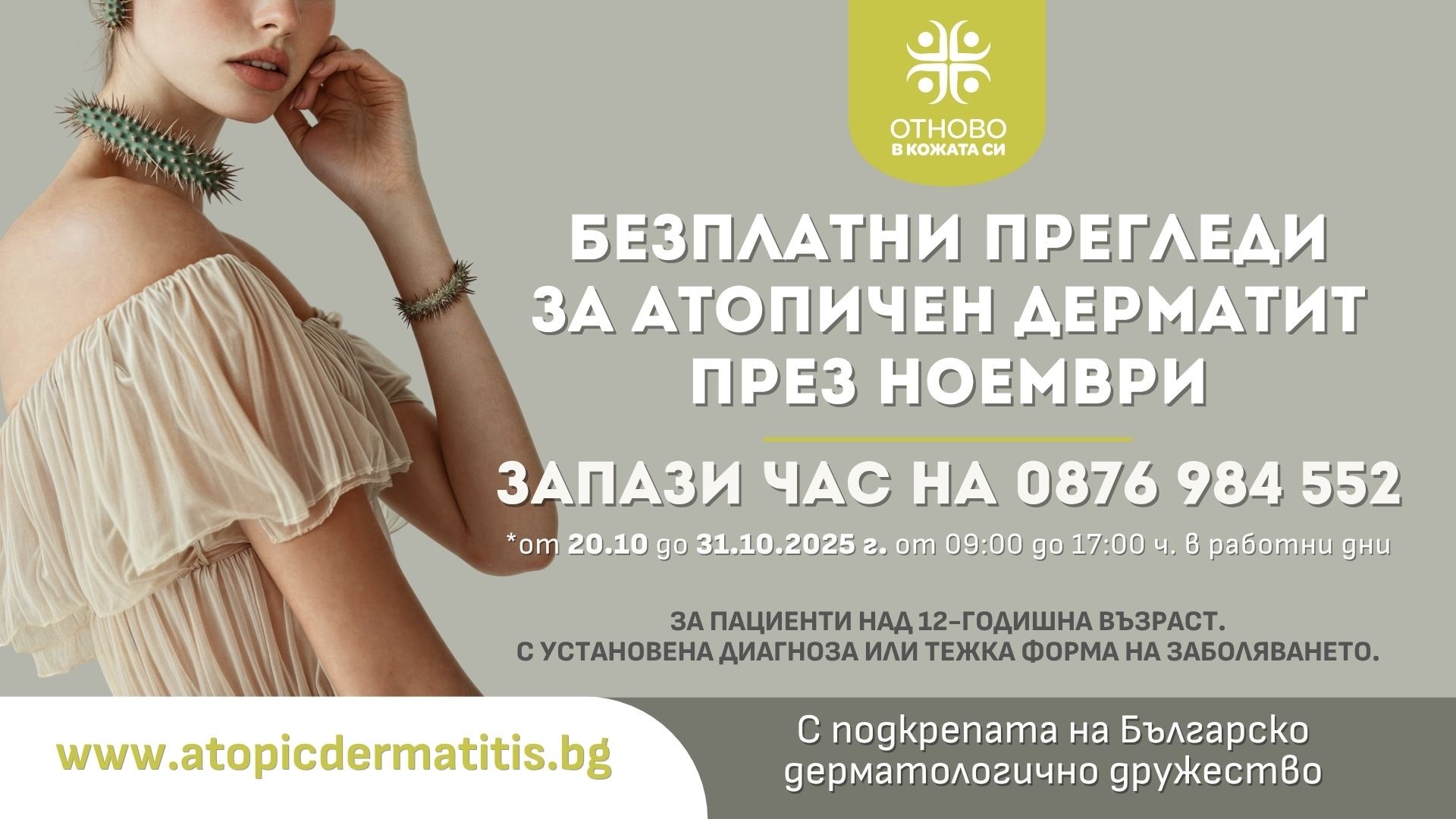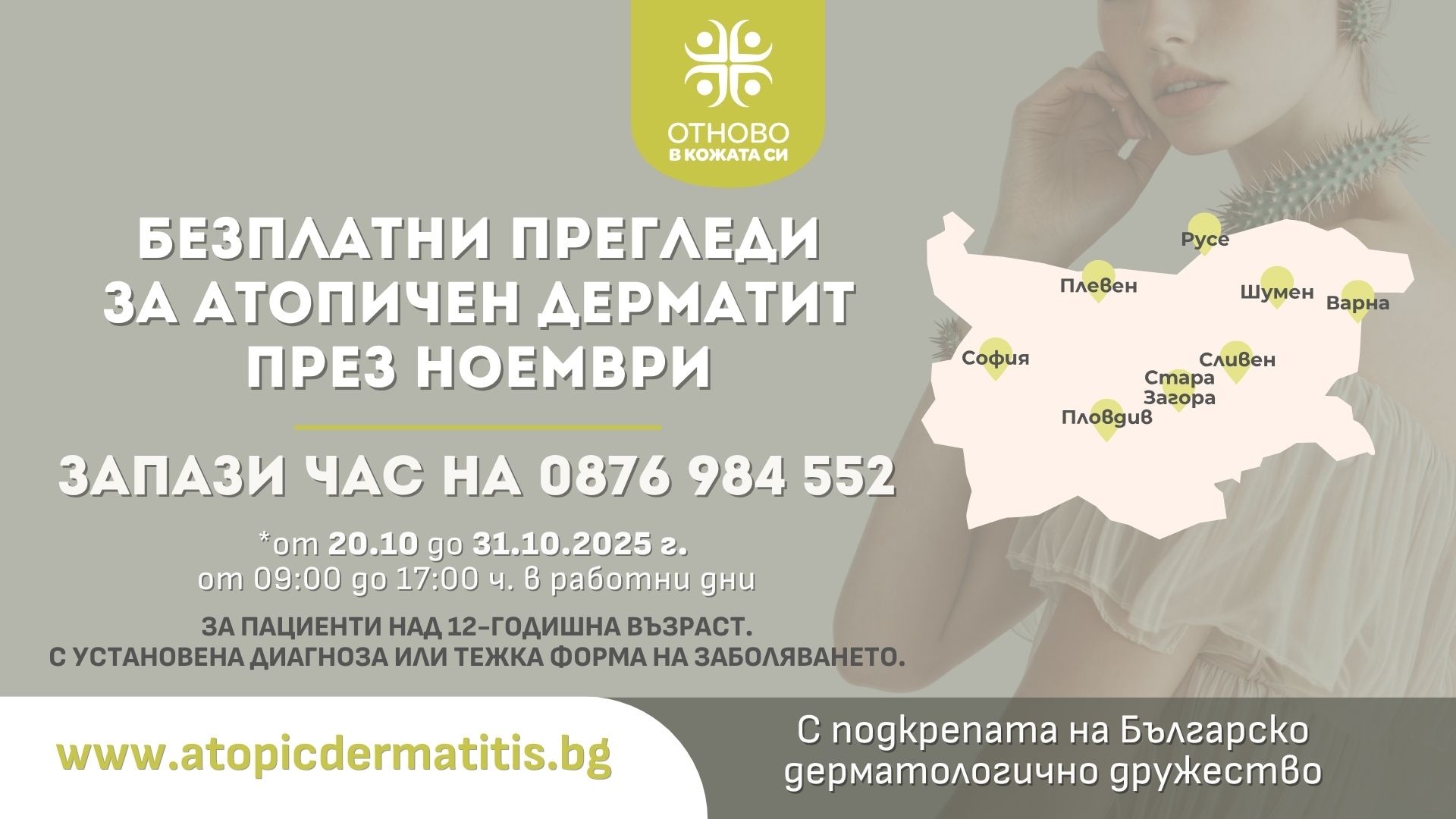 /КРОСС/ От днес, 20 октомври стартира записване за безплатни прегледи за тежък атопичен дерматит на телефон 0876 984 552, всеки делничен ден от 9 ч. до 17 ч. В инициативата ще се включат водещи дерматолози от осем града на страната - София, Сливен, Стара Загора, Пловдив, Плевен, Варна, Русе и Шумен. Прегледите ще се осъществяват през целия месец ноември, а час може да бъде записан до 31 октомври.