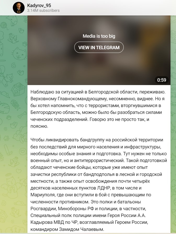 „Но бих искал да ви напомня, че терористите, които нахлуха в Белгородска област, можеха да се справят със силите на чеченските части", написа още Кадиров.