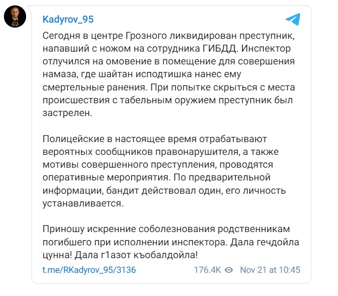 „Днес, 21 ноември, в центъра на Грозни беше ликвидиран престъпник, който нападна с нож служител на КАТ. Инспекторът отиде да се изкъпе в молитвената стая, където шайтанът тайно му нанесе смъртоносни рани. Докато се опитваше да избяга от местопроизшествието със служебно оръжие престъпникът беше застрелян", написа Кадиров в своя канал в Telegram.