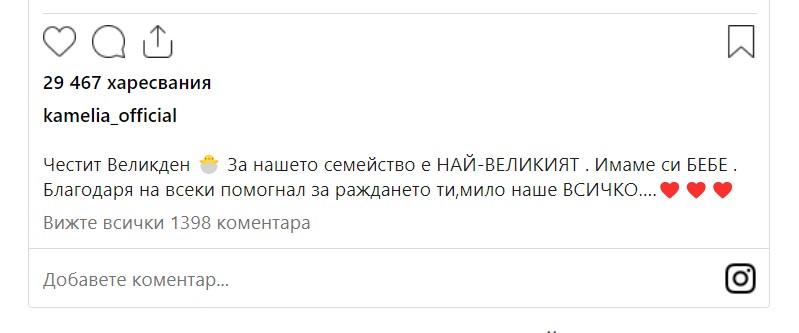 „Честит Великден! За нашето семейство е НАЙ-ВЕЛИКИЯТ. Имаме си БЕБЕ. Благодаря на всеки, помогнал за раждането ти, мило наше ВСИЧКО", написа тя, като добави сърчица след поста си.