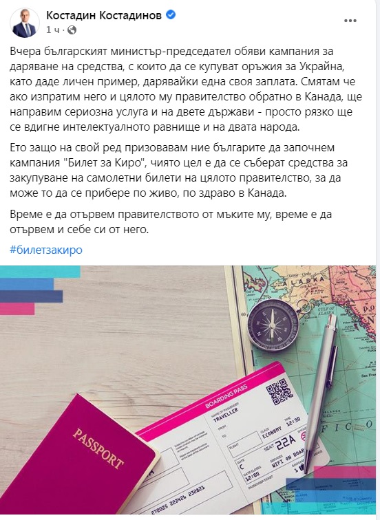 /КРОСС/ Ние българите да започнем кампания "Билет за Киро" призова на своята фейсбук страница лидерът на "Възраждане" Костадин Костадинов по повод вчерашният пост на Кирил Петков във фейсбук: