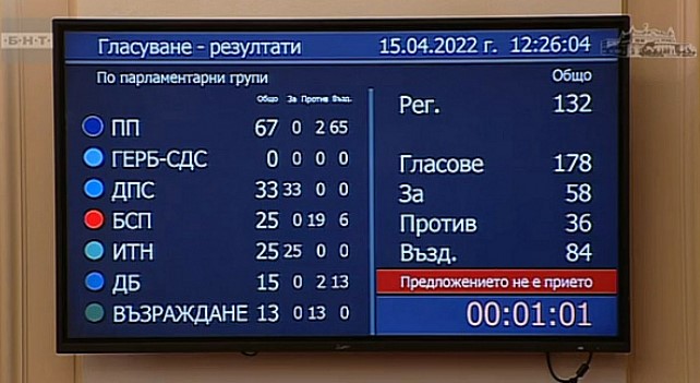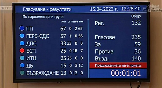 В гласуването на номинацията участваха 235 народни представители. 59 от тях се обявиха "за", 36-има бяха против, а 140 се въздържаха. Кандидатурата подкрепи всички гласували депутати от ДПС и ИТН (съответно 33-има и 25-има), както и един представител на ГЕРБ - СДС. "Против" гласуваха двама депутати от ПП, трима - от ДБ, 18 - от БСП и 13 - от "Възраждане". Броят на въздържалите се бе както следва: ПП - 65; ГЕРБ - СДС - 56; ДПС - 0; БСП - 7; ИТН - 0; ДБ - 12; "Възраждане" - 0.