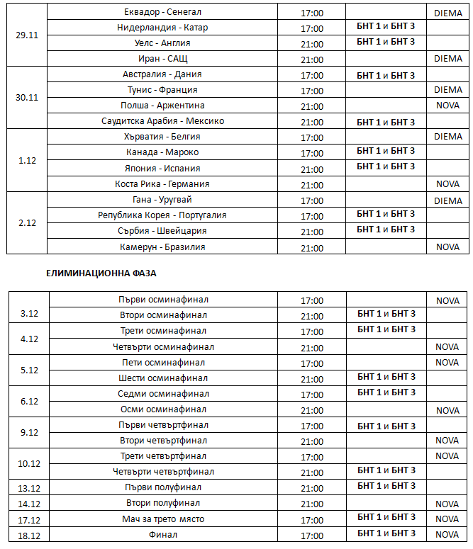 /КРОСС/ Българската национална телевизия и Нова Броудкастинг Груп разпределиха телевизионното излъчване на футболните мачове от ФИФА Световно първенство по футбол Катар 2022. Те ще бъдат програмирани в телевизионните канали БНТ 1 и БНТ 3, NOVA и DIEMA. Футболните фенове ще могат да гледат вълнуващите двубои и онлайн в сайта на обществената телевизия - bntsport.bg и в мобилното приложение BNT News, както и в каналите от премиум пакета DIEMA XTRA в HD, онлайн в стрийминг платформата PLAY DIEMA XTRA. Благодарение на партньорството между двата телевизионни оператора, българските зрители ще имат възможност да се насладят на 22-ото издание на финалите за световната купа, които ще се проведат в Катар през последните два месеца на годината.