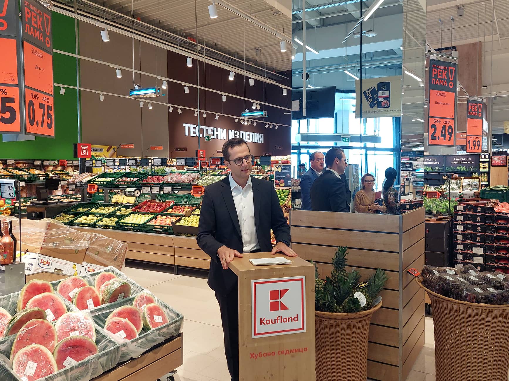 Изпълнителният директор на търговската вертига Иван Чернев акцентира върху нововъведенията, които са заложени в новия им обект. Той обърна специално внимание на "Фермерския пазар", който е част от магазина и който позволява на клиентите да се докосват на продуктите на множество сертифицирани ферми от цялата страна.
