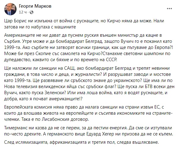 /КРОСС/Американците не ни дават да пуснем руския външен министър да кацне в Сърбия. Утре може и да бомбардират Белград, защото Вучич го е поканил като 1999-та. Ако сърбите ни затворят всички граници, как ще пътуваме до Европа?! Може би през Скопие със самолета на Кирчо? Станахме световни шампони по дупедавство, каквито си бяхме и по времето на СССР.