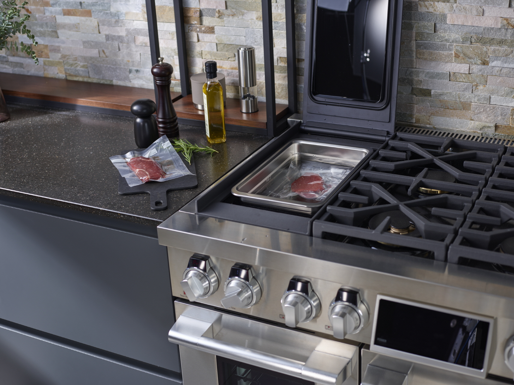 Ослепителното кулинарно изживяване е осигурено от SIGNATURE KITCHEN SUITE. Пълният пакет включва фурна, индукционна плоча, хладилник, съдомиялна, място за съхранение на вино и еспресо машина. Собствениците на дома ще останат удивени от множеството усъвършенствани възможности на фурната като способността й да приготвя здравословни и вкусни ястия благодарение на модернизираните си готварски функции за готвене на пара и конвекция. ProHeat™ разпределя равномерно топлината в цялата фурна, Speed Clean™ осигурява бързо и лесно почистване на пръски и изпечени остатъци от храна. LG ще представи за пръв път линия от винарски изби, за да допълни европейския SIGNATURE KITCHEN SUITE, нови серии стенни фурни със стъклени елементи и дизайн, за възможно най-добър стил, както и мощна съдомиялна използваща високотемпературна пара.