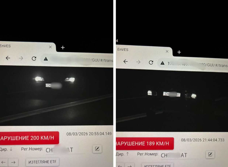 Първото засичане е станало в района на разклона за село Бинкос в посока Казанлък, където автомобилът е преминал със скорост 200 км/ч. Само 49 минути по-късно същият водач е заснет отново на същото място, този път със скорост 189 км/ч.