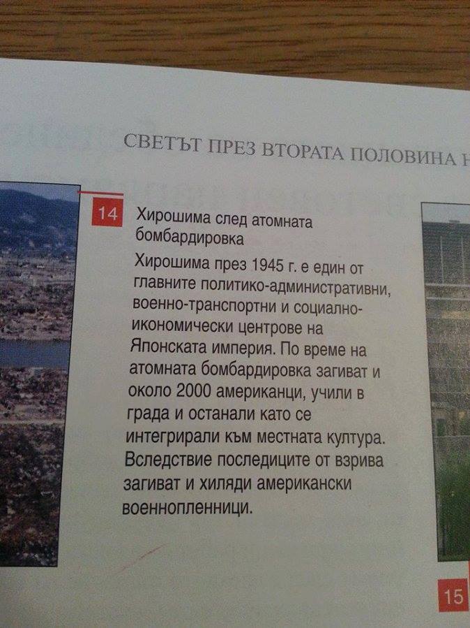 /КРОСС/„Тъй като днес е годишнината от втората американска атомна бомбардировка над Япония, да погледнем как тя е отразена в български учебник, който трябва да образова и да възпитава българските деца".