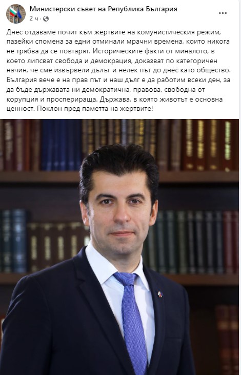 "Историческите факти от миналото, в което липсват свобода и демокрация, доказват по категоричен начин, че сме извървели дълъг и нелек път до днес като общество. България вече е на прав път и наш дълг е да работим всеки ден, за да бъде държавата ни демократична, правова, свободна от корупция и просперираща. Държава, в която животът е основна ценност. Поклон пред паметта на жертвите!", се казва още в публикацията.