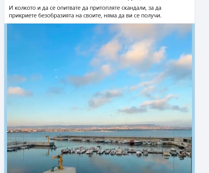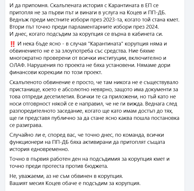 "Спомняте ли си скандалната европрокурорка Теодора Георгиева? Та Теди Еврото действаше под диктовката на приятелите си от ПП-ДБ. Тя беше отстранена от Кьовеши, но нейните сътрудници са все още там. И да припомня. Скалъпената история с Карантината в ЕП се притопля не за първи път и винаги в услуга на Коцев и ПП-ДБ. Веднъж преди местните избори през 2023-та, когато той стана кмет. Втори път точно преди парламентарните избори през 2024. И днес, когато подсъдим за корупция се върна в кабинета си. И нека бъде ясно - в случая "Карантината" корупция няма и обвинението не е за злоупотреба със средства. Ние бяхме многократно проверени от всички институции, включително и ОЛАФ. Нарушения по проекта не бяха установени. Нямаме дори финансови корекции по този проект. Скалъпеното обвинение се основава на твърдението, че там никога не е съществувало пристанище, което е напълно невярно. Има документи за това още отпреди десетилетия. Всички те са приложени, но, тъй като никой не носи отговорност, някой просто се е направил, че не ги вижда. Веднага след разпоредителното заседание, когато получа достъп до тях, ще ги представя публично, за да стане ясно каква пошла постановка се разиграва. Случайно ли е, според вас, че точно днес, по команда, всички функционери на ПП-ДБ бяха активирани да притоплят същата история едновременно. Точно в първия работен ден на подсъдимия за корупция кмет и точно преди протеста против бюджета. Не, уважаеми, аз не съм обвинен в корупция. Вашият месия Коцев обаче е подсъдим за корупция.