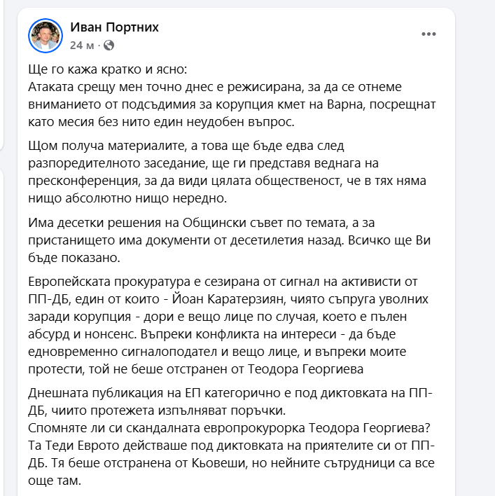 /КРОСС/ Ще го кажа кратко и ясно: атаката срещу мен точно днес е режисирана, за да се отнеме вниманието от подсъдимия за корупция кмет на Варна, посрещнат като месия без нито един неудобен въпрос, това написа в профила си във Фейсбук Иван Портних след като днес стана ясно, че европрокуратурата го е дала на съд.