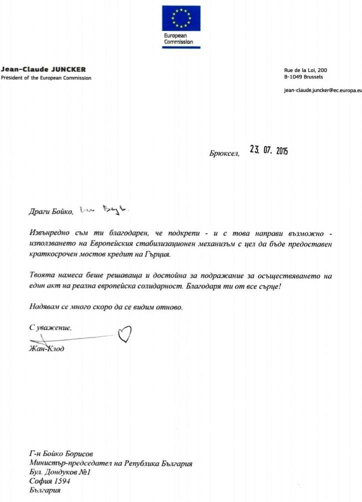 „Драги Бойко, Извънредно съм ти благодарен, че подкрепи - и с това направи възможно - използването на Европейския стабилизационен механизъм с цел да бъде предоставен краткосрочен мостов кредит на Гърция. Твоята намеса беше решаваща и достойна за подражание за осъществяването на един акт на реална европейска солидарност. Благодаря ти от сърце! Надявам се много скоро да се видим отново. С уважение, Жан-Клод ♥", пише председателят на ЕК.