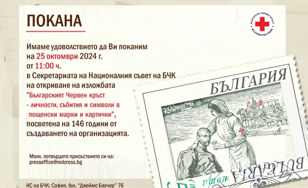 /КРОСС/ На 25 октомври 2024 г. от 11:00 ч. във фоайето на Секретариата на Националния съвет на Българския Червен кръст, ул. "Джеймс Баучер"№76 ще бъде открита изложбата "Българският Червен кръст - личности, събития и символи в пощенски марки и картички", посветена на 146 години от създаването на БЧК - най-голямата хуманитарна организация в България.
