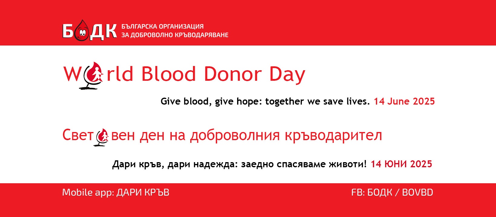 /КРОСС/ На 14 юни страните по Света отбелязват Световния ден на доброволния кръводарител като израз на благодарност към доброволните кръводарители за техния незаменим и безценен дар за здравето и живота на милиони хора. Денят има за цел да послужи и като насочване на правителствата и националните здравни органи към повече действия за осигуряване на подходящи ресурси за увеличаване на вземането на кръв от доброволни, неплатени донори и за осигуряване на достъп до безопасна кръв и услуги за кръвопреливане за всички, които се нуждаят от тях.