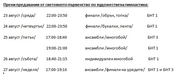 Световното първенство по художествена гимнастика по БНТ (Програма)