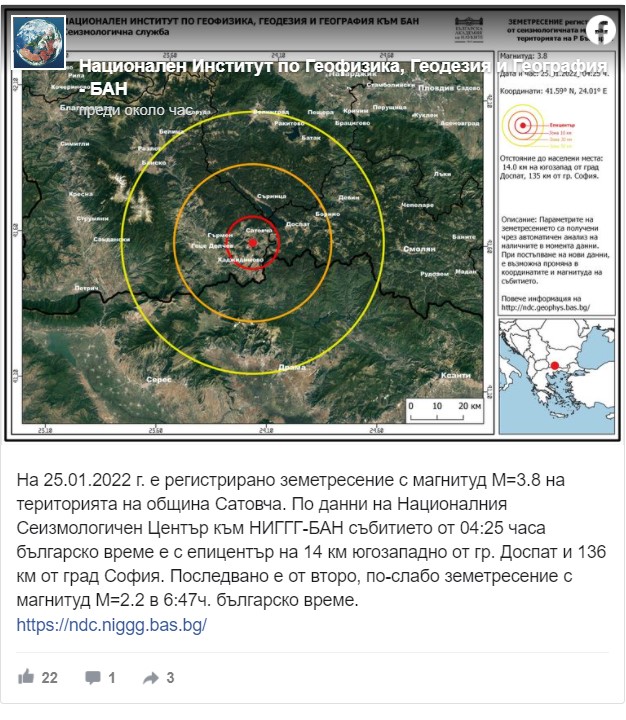 /КРОСС/ В 04.25 часа днес българско време е регистрирано земетресение с магнитуд 3.8 по Рихтер на територията на община Сатовча. Това съобщават сеизмолозите от Националния институт по геофизика, геодезия и география на БАН /НИГГГ-БАН/.