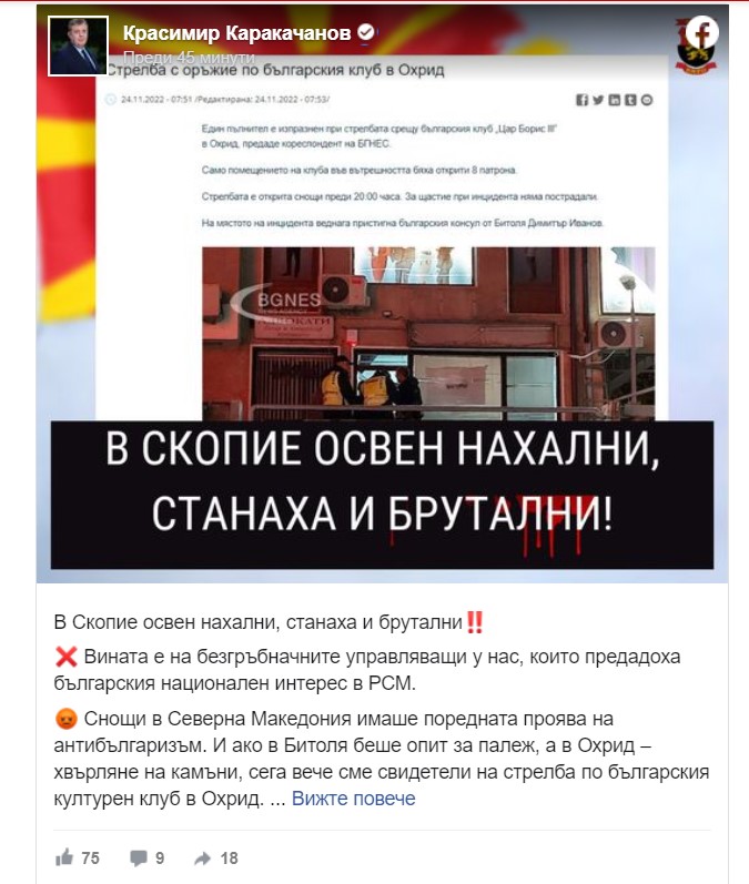 /КРОСС/ Снощи в Северна Македония имаше поредната проява на антибългаризъм. И ако в Битоля беше опит за палеж, а в Охрид - хвърляне на камъни, сега вече сме свидетели на стрелба по българския културен клуб в Охрид. Това написа във Фейсбук профила си почетния председател на ВМРО Красимир Каракачанов.