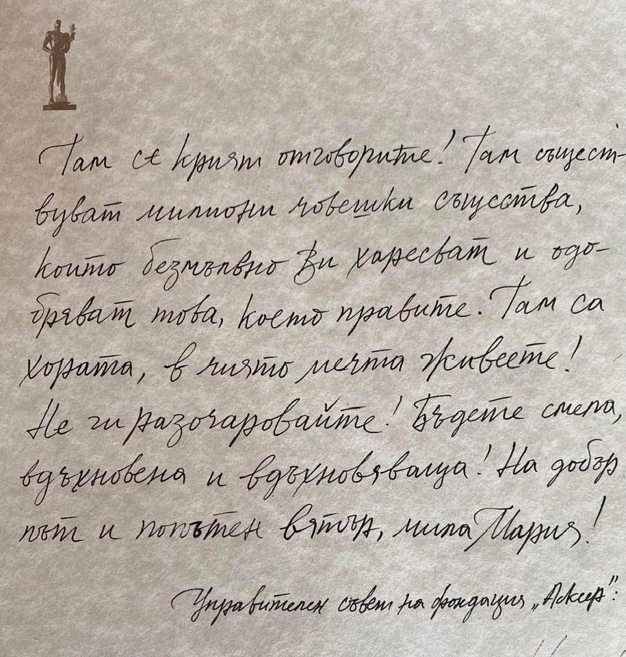 "Вероятно вече знаете, че по пътя Ви ще има много негативен шум, но вие слушайте тишината! Там се крият отговорите! Там съществуват милиони човешки същества, които безмълвно ви харесват и одобряват това, което правите. Там са хората, в чиято мечта живеете! Не ги разочаровайте! Бъдете смела, вдъхновена и вдъхновяваща! На добър час и попътен вятър, мила Мария!", пише още в писмото.