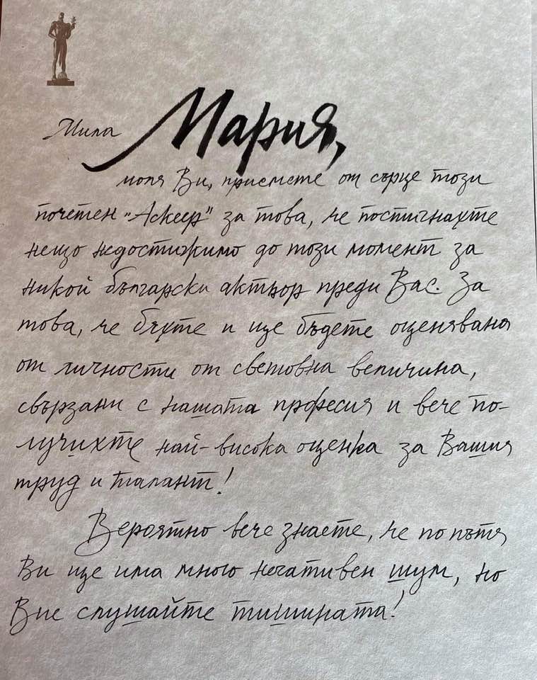 "Мила Мария, моля Ви приемете този почетен "Аскеер" за това, че постигнахте нещо недостижимо до този момент за никой български актьор преди Вас. За това, че бяхте и ще бъдете оценявана от личности от световна величина, свързани с нашата професия и вече получихте най-висока оценка за Вашия труд и талант". Това се казва в писмото, което Бакалова вече е получила, заедно със статуетката.