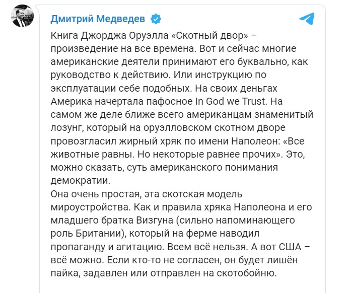 „Книгата на Джордж Оруел „Животинска ферма“ е произведение за всички времена. Дори сега много американски лидери я възприемат буквално като ръководство за действие или наръчник с инструкции за себеподобните“, пише още Медведев.