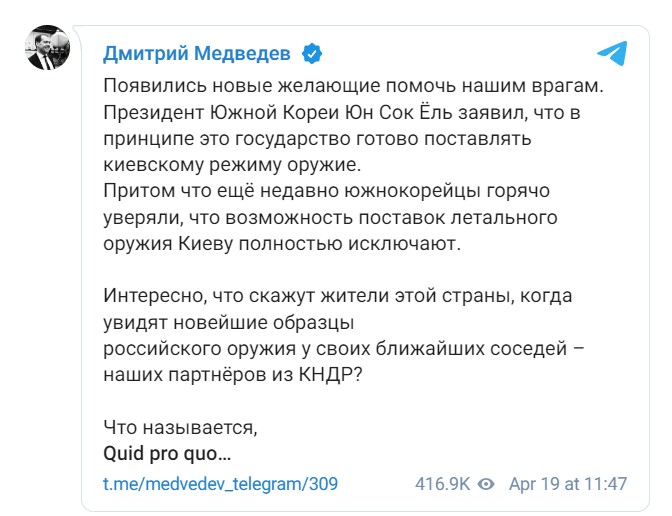 /КРОСС/ Заместник-председателят на Съвета за сигурност на Руската федерация Дмитрий Медведев предупреди за опасността от плановете на Южна Корея да доставя оръжие на Украйна.
