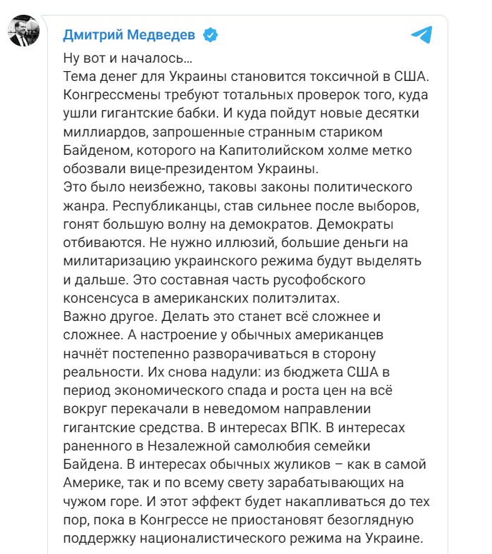 /КРОСС/ Конгресът на САЩ рано или късно ще прекрати „безразсъдната подкрепа" на Киев, „Америка винаги е изоставяла своите приятели". Това мнение изрази заместник-председателят на Съвета за сигурност на Руската федерация Дмитрий Медведев в своя канал в Telegram.