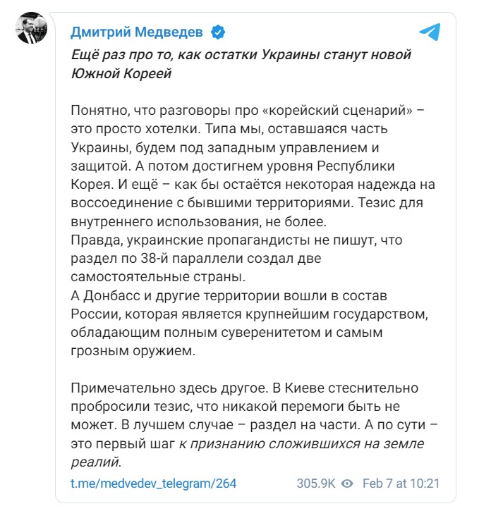 /КРОСС/ Заместник-председателят на Съвета за сигурност на Русия Дмитрий Медведев нарече изявленията от Киев за предполагаемата готовност на Запада да раздели Украйна „според корейския сценарий" като първа стъпка към признаване на съществуващите териториални реалности.