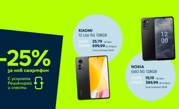 Сред предложенията на „Рециклирай и спести“ през май е и NOKIA G60 5G, създаден със специално отношение към природата. Той е с гръб от 100% и рамка от 60% рециклирана пластмаса и идва в опаковка от рециклирани материали. За да насърчи по-дългото ползване на телефона, към удължената 3-годишна гаранция от Yettel, производителят поема ангажимент за 3 актуализации на Android OS и 3 години месечни актуализации на сигурността. Nokia G60 5G е първият смартфон от G-серията с дълголетие, емблематично за по-високия клас устройства от X-серията на бранда. В комбинация с 6,58” FHD+ 120Hz дисплей за супер плавно скролване и 50MP тройна камера с изкуствен интелект, нощен и Dark Vision режим и GoPro Quik App, Nokia G60 5G прави първокласното мобилно изживяване по-достъпно. Този месец екологичният смартфон струва с 25% по-малко и вместо за 449,99 лв. може да бъде взет за 336,99 лв. в брой с Total Unlimited 39.99, договор за 24 месеца и връщане на старо устройство, което Yettel да рециклира. Цената на лизинг пък пада от 22,99 лв. на 16,89 лв. на месец за 24 месеца.