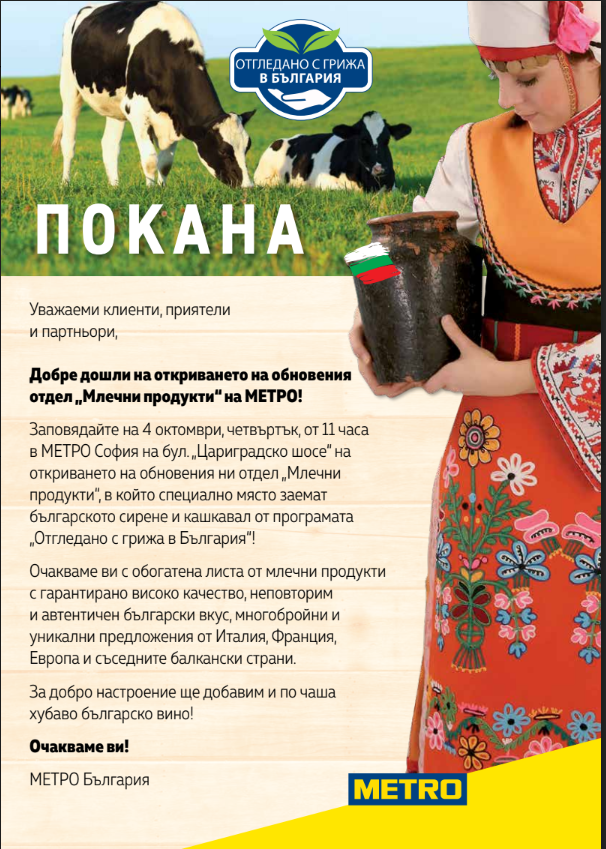 За 2018 година продажбите на българска земеделска продукция от малки фермери достига 4 300 тона. Програмата, наречена „Отгледано с грижа в България“, превърна МЕТРО в посредник между местните земеделски производители и професионалните му клиенти от хотелския и ресторантьорски бизнес. Сега „Отгледано с грижа в България“ насочва усилията си и към млечните храни и продукти.