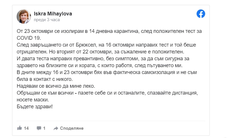 Михайлова, която е заместник-председател на групата „Обнови Европа“ в Европейския парламент, посочва още, че в дните между 16 октомври, когато се е завърнала от Брюксел и 23 октомври, е била в самоизолация.