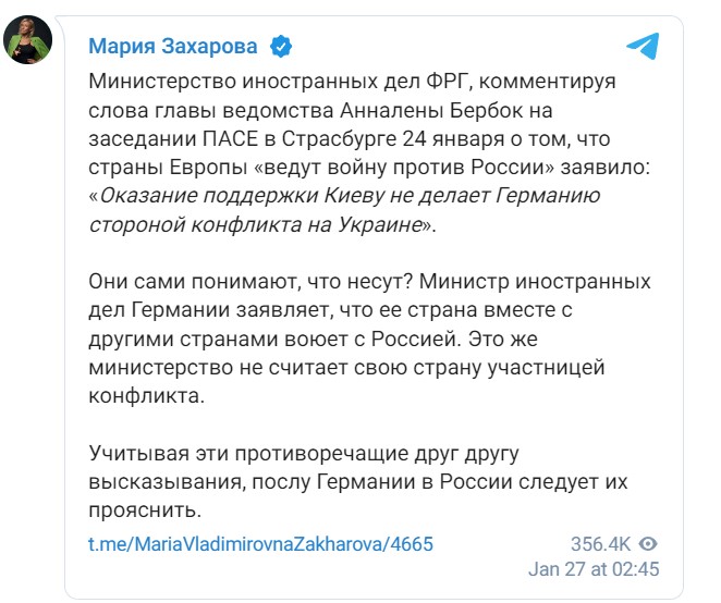 "Външният министър на Германия заявява, че нейната страна, заедно с други страни, е във война с Русия. Същото министерство не счита страната си за страна в конфликта. Като се имат предвид тези противоречиви изявления, германският посланик в Русия трябва да ги изясни ", заяви още Захарова.