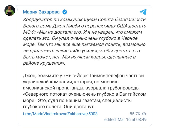 /КРОСС/ Официалният представител на руското външно министерство Мария Захарова препоръча на САЩ да потърсят помощ за намирането на дрон, паднал в Черно море, от украинска компания, която според западни медии може да е замесена в експлозиите в „Северен поток".