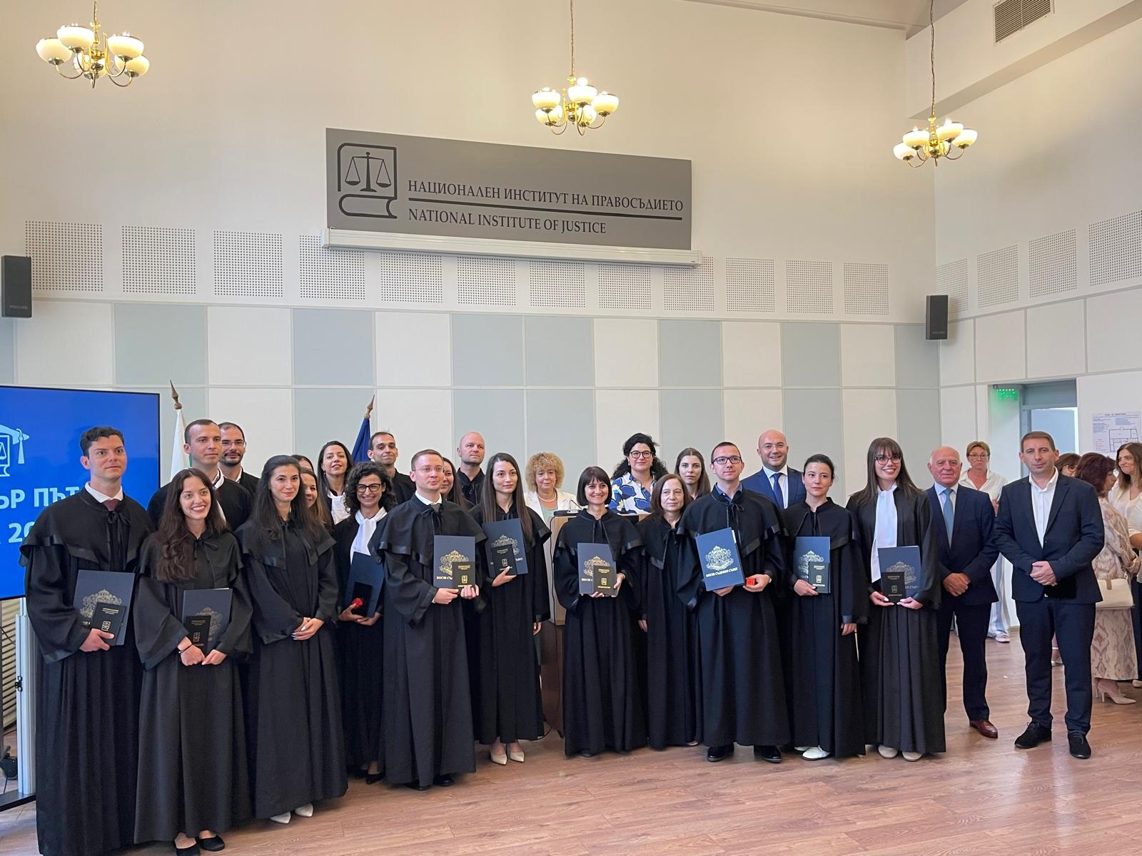 Днес преминалите 9-месечния курс на обучение в НИП младши съдии, прокурори и следователи получиха свидетелствата си от директора на института Миглена Тачева в присъствието на министър Георгиев, председателя на Върховния касационен съд Галина Захарова, и.ф. главния прокурор Борислав Сарафов, представляващия ВСС Боян Магдалинчев, членовете на Управителния съвет на НИП.