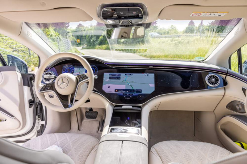 Вътре, широкият 141 сантиметра хиперекран веднага привлича вниманието. Зад специално произведеното стъклено стъкло има три OLED екрана, всеки 12,3 инча за водача и пътника отпред и огромен 17,7 инча екран в информационно-развлекателната зона, който работи с най-новата версия на MBUX, предлага голям брой опции и стартира бързо.