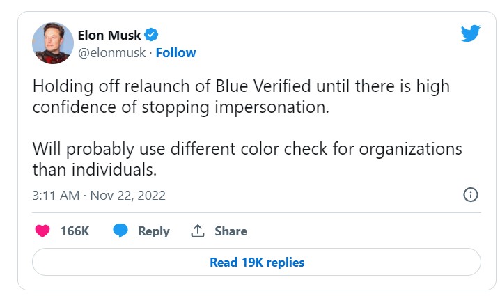 Мъск съобщи в туит, че пускането на услугата за верификация на профили "Блу верифайд" (Blue Verified) или т. нар. сини значки се отлага, "докато се създаде силно доверие в спирането на фалшифите профили". Вероятно ще се използва различно цветово означаване за организациите и индивидуалните потребители, допълва той, цитиран от ДПА.