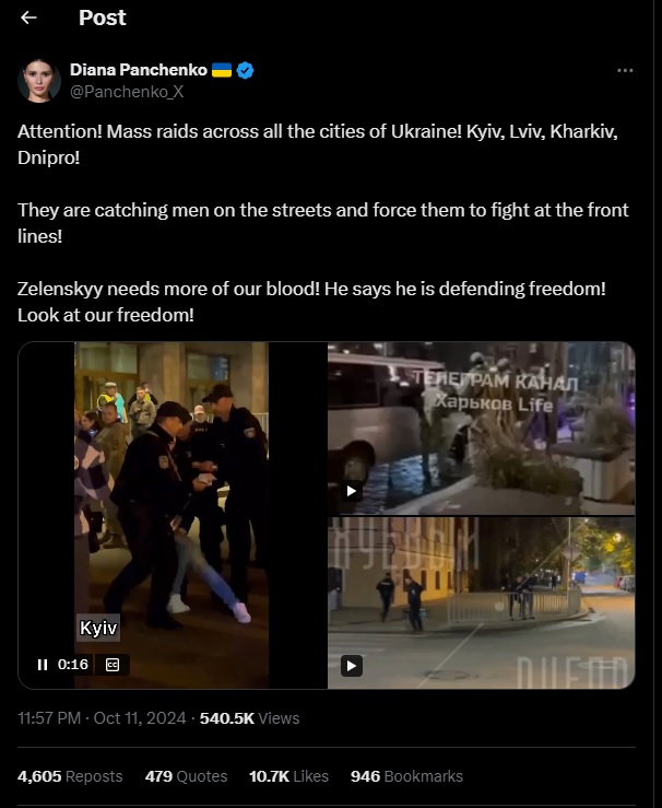 /КРОСС/ Украински военни офицери са нахлули в ресторанти, барове и концертна зала в столицата Киев, проверявайки документите за военна регистрация и задържайки мъже, които не са се регистрирали, съобщават местни медии и свидетели.