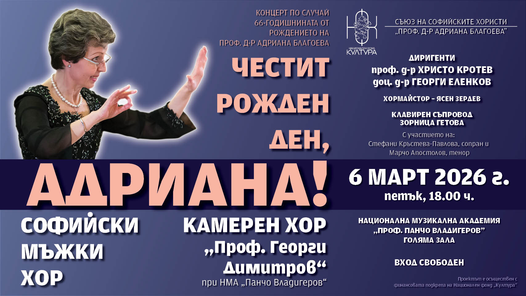 Финансираният от Национален фонд „Култура" концерт „Честит рожден ден, Адриана!" е концерт-посвещение, който ще се проведе на 6 март 2026 г., в концертната зала на Националната музикална академия „Проф. Панчо Владигеров". Събитието ще отдаде почит на живота, педагогическата дейност и хоровото наследство на проф. д-р Адриана Благоева - изтъкнат диригент, преподавател и дългогодишен обществен деец. Концертът ще обедини нейни колеги, студенти, Софийски мъжки хор и смесения камерен хор „Проф. Георги Димитров" при НМА „Проф. Панчо Владигеров", които ще представят специално подготвена музикална програма с класически и съвременни хорови произведения, отразяващи творческия път и педагогическите принципи на проф. Благоева. В програмата на концерта се предвижда редуване на блокове от музикални изпълнения и излъчване на кратки видео клипове с материали от различни етапи на живота ѝ, както и интервюта с колеги и нейни студенти.