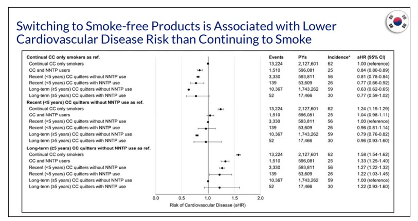 Последните такива данни идват от Корейската национална здравноосигурителна каса, която е анализирала базата си данни в изследване на връзката между преминаването от цигари на бездимни никотинови алтернативи и как това променя риска за сърдечносъдовата система. Здравните власти направили скрининг на 5 159 538 възрастни мъже, които са преминали прегледи на два етапа – през 2014 и 2018 г. Всички участници са били разделени на групи според индивидуалната им история, свързана с пушенето: дългогодишни пушачи, пушачи, които употребяват и негорими никотинови продукти, пушачи, които вече са отказали цигарите с помощта на бездимна никотинова алтернатива, бивши непушачи от повече от 5 години; хора, които никога не са пушили.