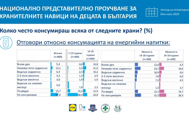 /КРОСС/ Всяко второ дете в България на възраст между 7 и 18 години е консумирало енергийни напитки. Това сочат данните от най-новото национално представително проучване за хранителните навици на децата у нас, проведено в периода юни - юли 2024 г. по поръчка на Лидл България и реализирано от изследователска агенция Blue Point.