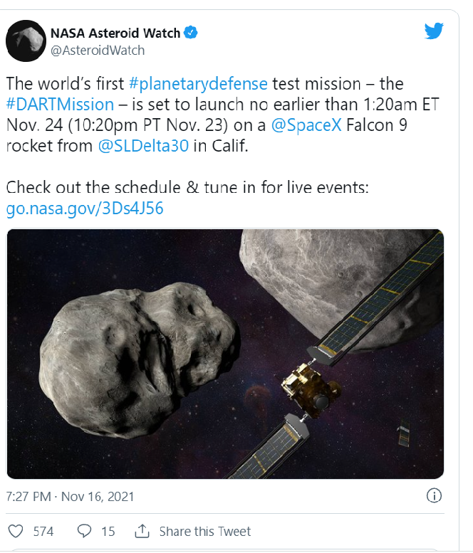 Сондата ДАРТ (DART - Double Asteroid Redirection Test) е планирано да бъде изстреляна във вторник сутринта българско време.