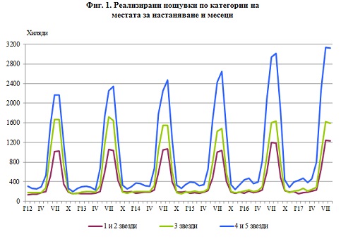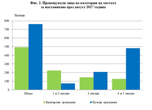 Броят на пренощувалите лица в местата за настаняване през август 2017 г. се увеличава с 6.3% в сравнение със същия месец на 2016 г. и достига 1 256.6 хил., като е регистрирано увеличение със 7.5% при чужденците и с 4.6% при българите. Българските граждани, нощували в местата за настаняване през август 2017 г., са 493.8 хил. и са реализирали средно по 3.3 нощувки. Чуждите граждани са 762.8 хил., като 63.0% са нощували в хотели с 4 и 5 звезди и са реализирали средно 5.7 нощувки.