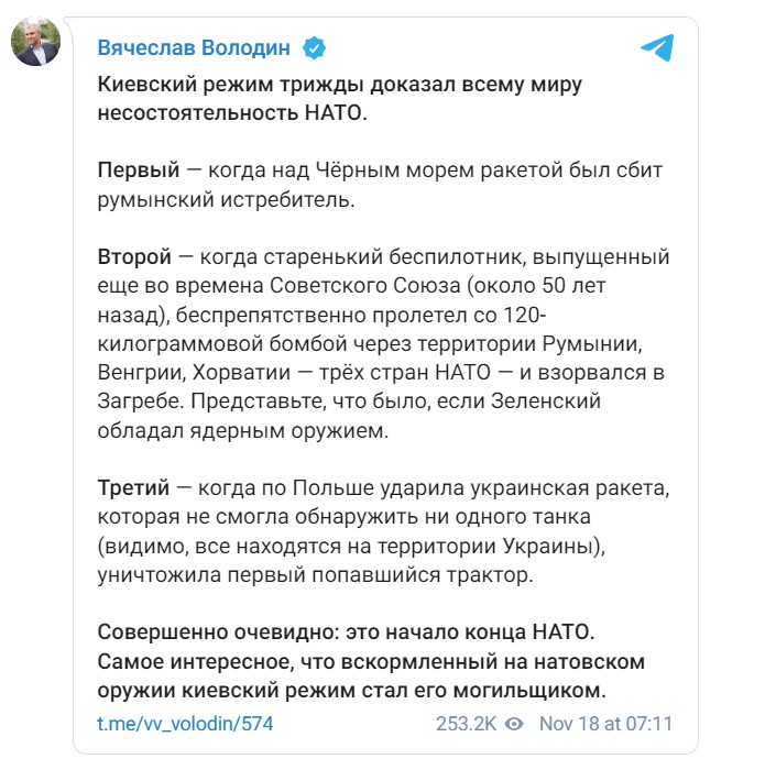 "Съвсем очевидно е, че това е началото на края на НАТО. Най-интересното е, че режимът в Киев, хранещ се с оръжия на НАТО, стана негов гробокопач. Режимът в Киев доказа три пъти провала на НАТО на целия свят ", написа Володин в своя канал в Telegram.
